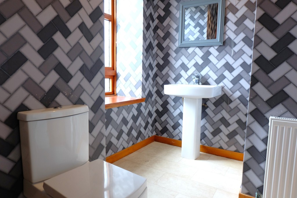 This bright room has wall papered walls and benefits from a white WC, as well as a pedestal sink. There is a shower quadrant with wet wall and chrome controls. Vinyl has been laid to the floor. This room benefits from a pendant light fitting, a central heating radiator and an opaque window to the front elevation.