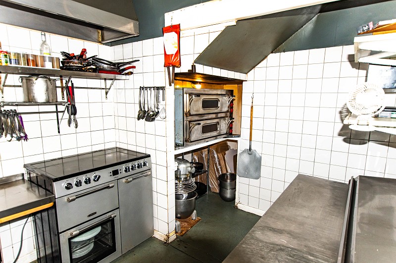 The commercial kitchen has been tiled and has non slip flooring. There is a stainless-steel double pizza oven, fryers, cookers and a prep fridge. The kitchen also benefits from a dough maker, an extractor hood and florescent lighting as well as wall mounted shelves.