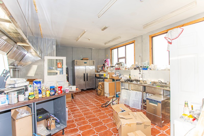 This large and bright kitchen benefits from two large windows to the front elevation. There is a large three-section industrial extractor unit. There are also two industrial stainless-steel sinks with drainers. This room also benefits from a laminate worktop with storage space below. The flooring has been laid with ceramic tiles, and the walls have been painted grey. Above there are four fluorescent light fittings as well as a heat detector. At the rear corner there is also a smaller sink attached to the wall with a mixer tap. Steps lead to an upstairs storage room.