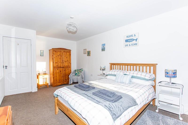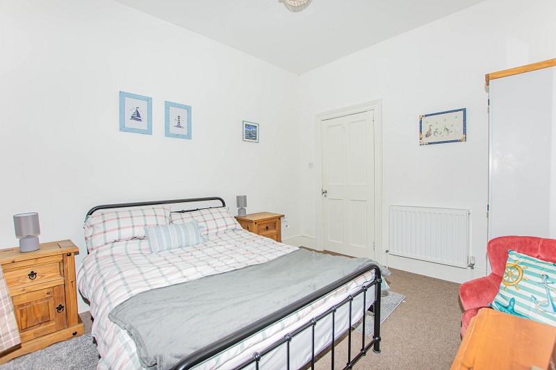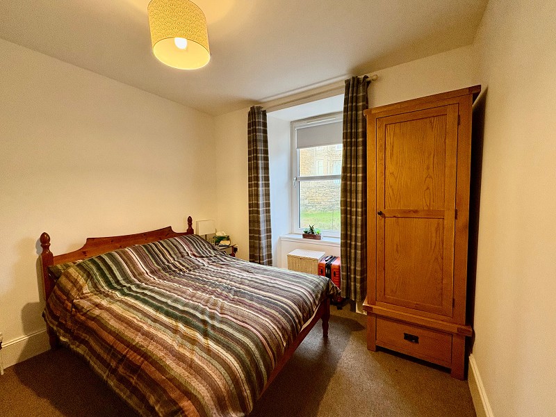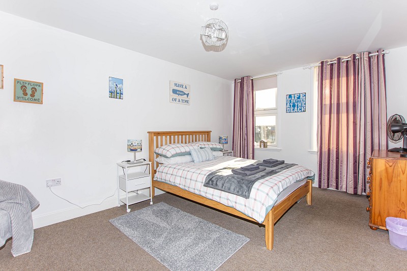 This spacious and bright bedroom benefits from two large windows that take in stunning views over Wick Harbour. The walls have been painted white and the flooring has been laid to carpet. There is a central heating radiator to the wall and above a pendant light fitting can be found.