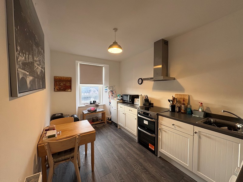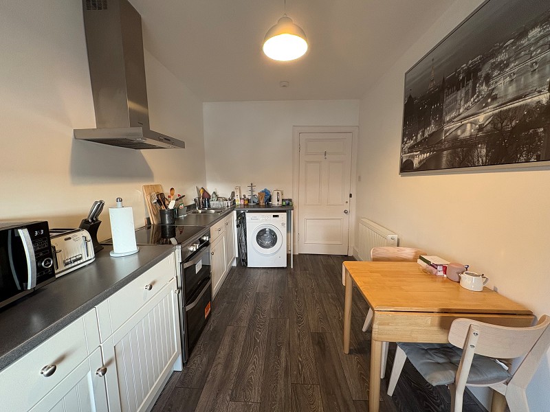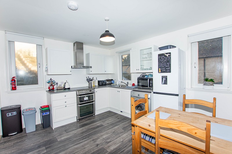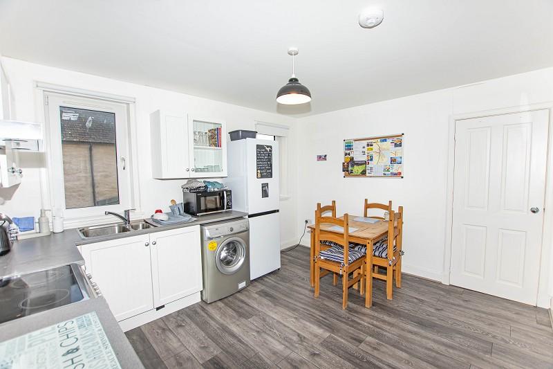 This modern kitchen has white-painted base units with grey laminate worktops. There is a stainless-steel sink with a drainer. There is a standalone electric cooker, with a built-in hob, above the cooker there is an extractor hood. Space for a washing machine can also be found. The walls have been painted white, and the flooring is laid with grey wood-effect vinyl. A window can be found on the front elevation that lets in a lot of natural daylight and takes in superb views over Wick Harbour. Above, a pendant light fitting and smoke alarm can be found, as well as a central heating radiator to the wall.