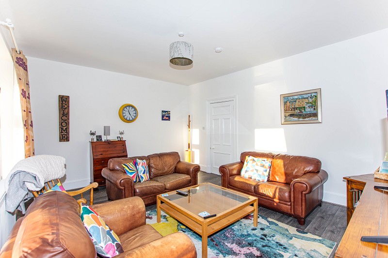 This stunning bright lounge benefits from two large windows to the front elevation that take in superb views over Wick Harbour. The walls have been painted white, and the flooring has been laid with grey wood-effect vinyl. Above, a pendant light fitting and smoke alarm can be found. This room also benefits from a storage cupboard that houses the electrics. A central heating radiator can be found on the wall, and ample power points can be found throughout the room.