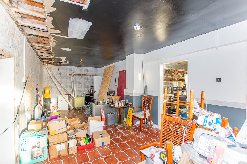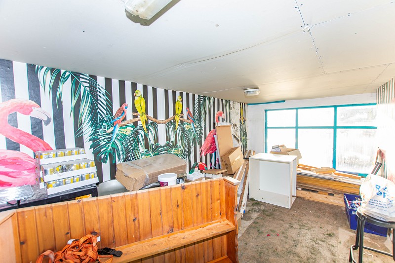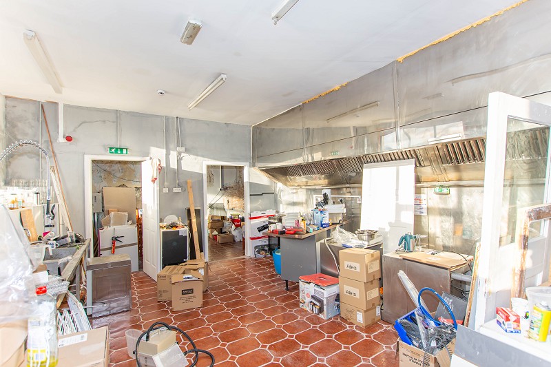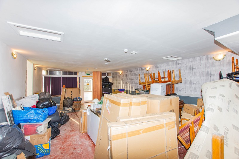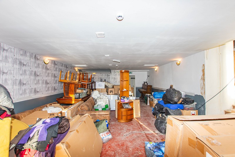This room is of very good proportions; the flooring is ceramic tiles, and the walls are lath and plaster. Although in need of some work, the scope for opportunity is endless. There are two windows to the front elevation that let in a lot of natural daylight. On the wall is a unit that holds the controls for the building's alarm system. A door to the side leads to the kitchen; another door to the rear leads to the industrial freezer and w.c.