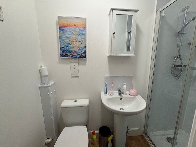 This bright lounge benefits from a window to the front elevation that takes in stunning views over Wick Harbour. The walls have been painted white, and the flooring has been laid with grey wood-effect vinyl. Above, a pendant light fitting and smoke alarm can be found. This room also benefits from a central heating radiator that can be found to the wall, and ample power points can be found throughout. There is also a storage cupboard that houses the electrics.