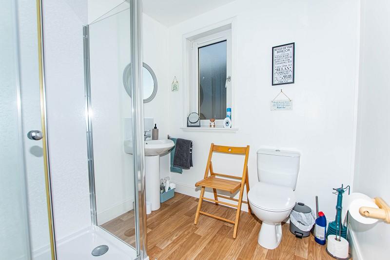 This bathroom benefits from a w.c., a handbasin with a mixer tap and a mirror above. There is a walk-in shower cubicle with a mains shower. The flooring has been laid to wood-effect vinyl, and the walls have been painted white. This room also benefits from an opaque window to the side elevation. Above, a flush-light fitting and extractor fan can be found. There is also a central heating radiator on the wall.