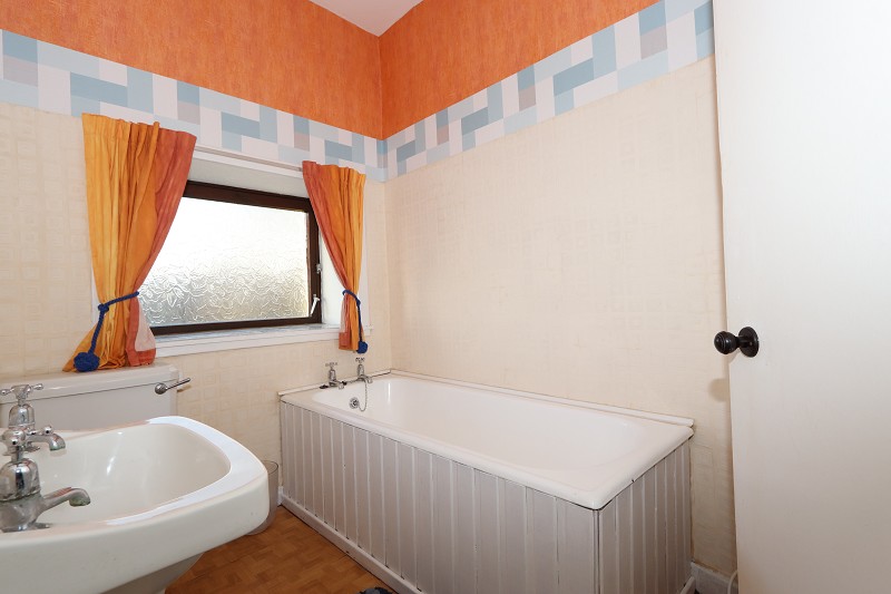 There is a three-piece suite comprising a bath, W.C. and handbasin. There is a radiator to the wall and the flooring is laid to vinyl tiles. An opaque window faces to the rear.