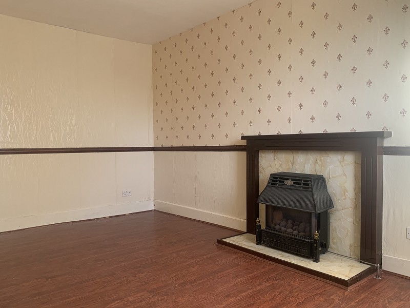 This large room has a coal effect gas fire set on a hearth with timber mantle and surround. There is a shelved alcove with cupboards below housing the electrics. A window with a deep sill faces to front. There is a long radiator to the wall. The flooring is laid to laminate.