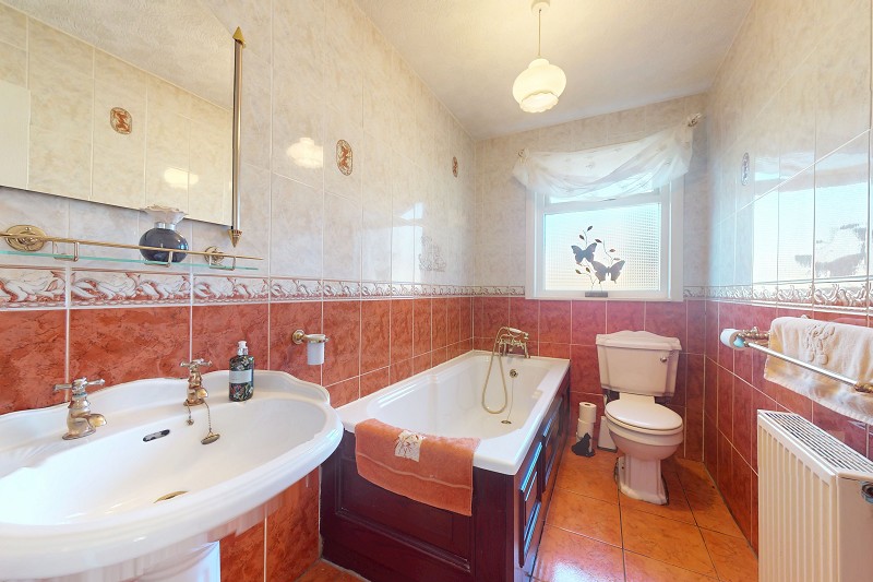 The bright bathroom has been tiled from floor to ceiling. There is a bath with a shower above, a WC as well as a pedestal sink with a shelf and mirror above. This room benefits from a central heating radiator, a pendant light fitting and brass toiletry accessories. There is an opaque window which faces the rear elevation.