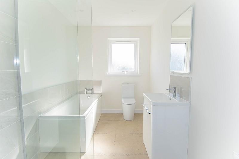 Immaculately presented throughout, this tastefully designed bathroom benefits from a large walk-in shower, a bath, W.C and basin that has been built into a white vanity unit. The walls have been partially tiled. An opaque window faces the rear elevation. There is an illuminated mirror, ceiling downlighters and a central heating radiator.