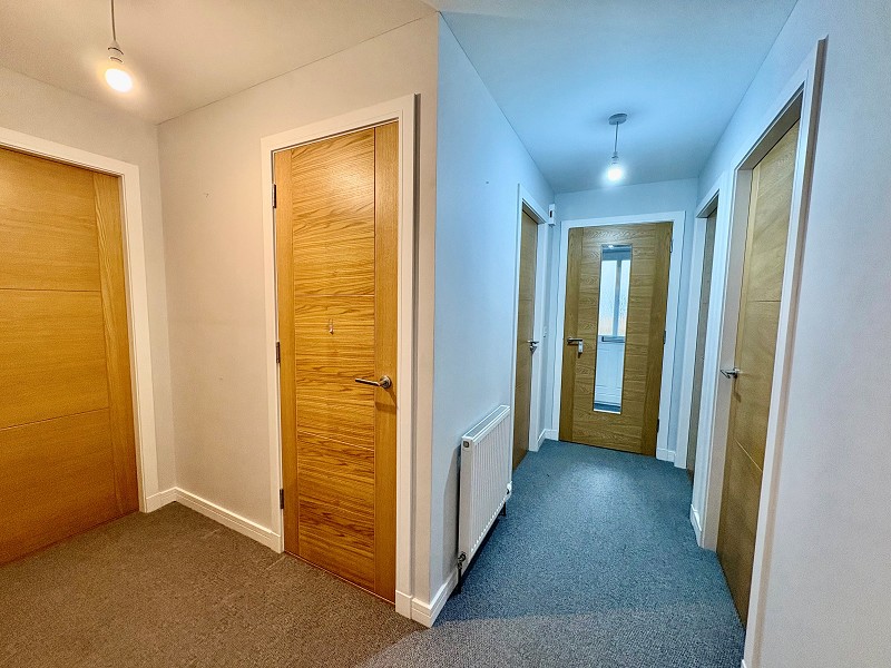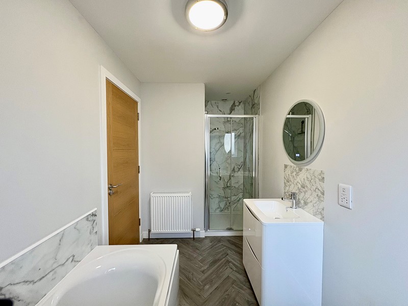 This beautiful room is spacious and benefits from a recessed shower, a bath, WC and the basin is built into a white high glass vanity unit. There is a circular illuminated mirror as well as a shaving point. Vinyl has been laid to the floor. This room also benefits from a central heating radiator, a flush light fitting and a wall mounted cupboard. An opaque window faces the side elevation.
