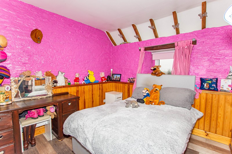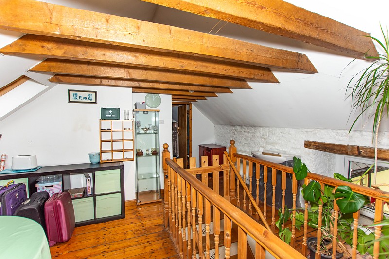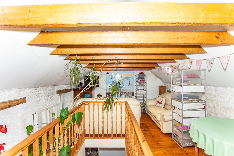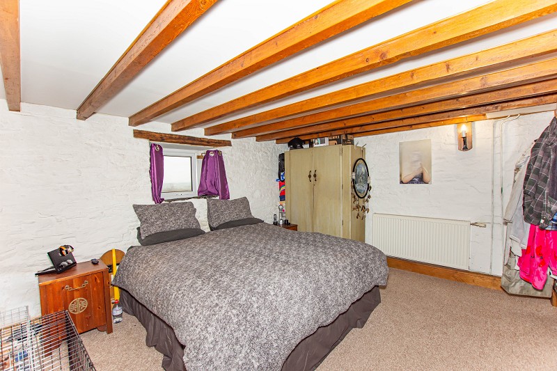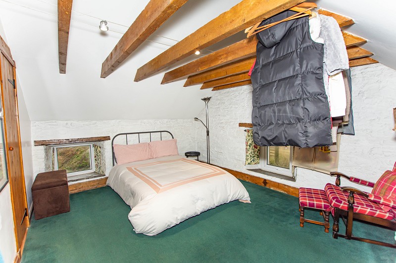 This superb room benefits from dual aspect windows and original wooden flooring. There are exposed stone walls, and ceiling beams with strip lighting. Partially coombed, this excellent room is of good proportions and enjoys scenic views across the countryside. A door leads into the third bedroom.