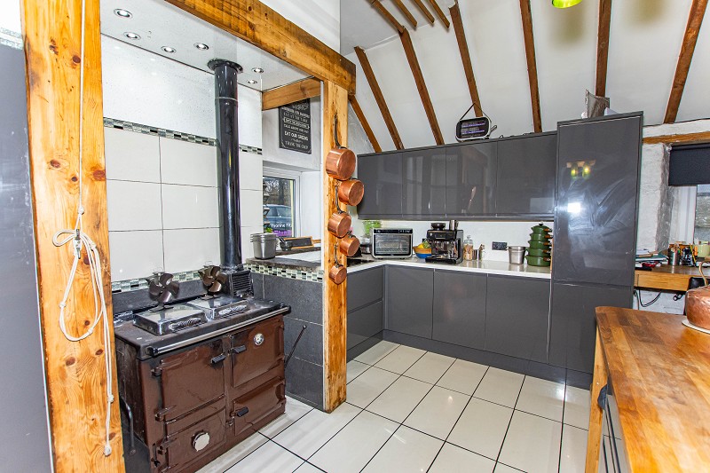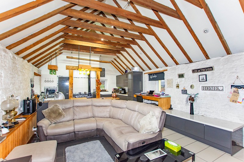 The lounge and kitchen are open plan with a stunning vaulted ceiling. This room has exposed ceiling beams and triple aspect windows. There are feature drop down light fittings, exposed stone walls as well as ceramic tiled flooring. The superb kitchen is well presented and has an excellent range of grey base, wall and full height units with oak laminate worktops. there is a white sink and drainer, an integral fridge, induction hob and Rayburn Range cooker with a back boiler. A clothes pulley has been ideally placed above the Rayburn. A wooden mantle above the Rayburn creates a focal point within this splendid room. There is also a seating area and workstation. This is a light and bright reception room.