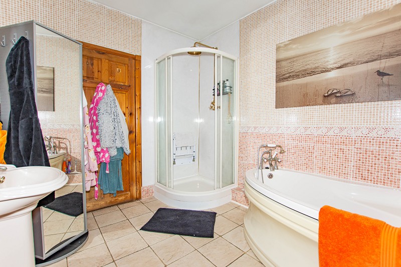 This beautiful room benefits from a corner bath, a shower quadrant as well as a pedestal basin and a WC. Tiles have been fitted to both the walls and the floor. There is also a central heating radiator, an extractor fan and ceiling downlighters. An opaque window faces the front elevation.