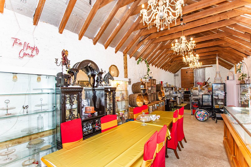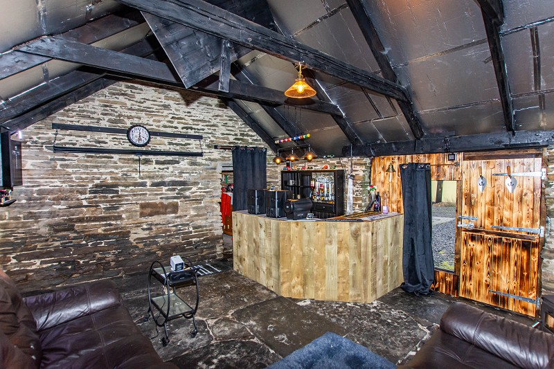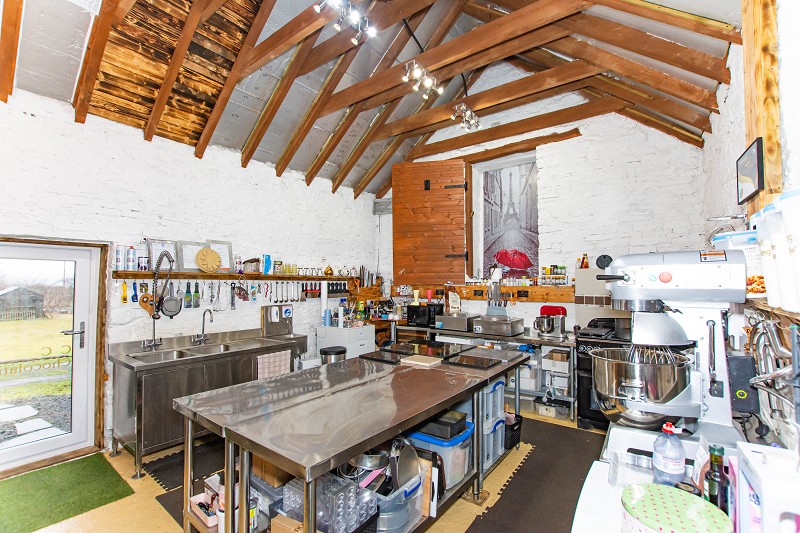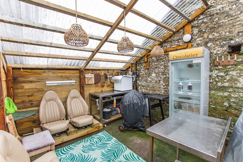 Formerly used as a business premises, this stunning character-building benefits from four light chandeliers as well as three chrome light fittings. There is wall mounted shelving, power as well as water and a cosy multi fuel stove which provides heat for the building. This spacious room also benefits from chrome power points, sliding patio doors with blinds as well as a UPVC window and fully glazed door. There is a vaulted ceiling with exposed ceiling beams and a feature papered wall.