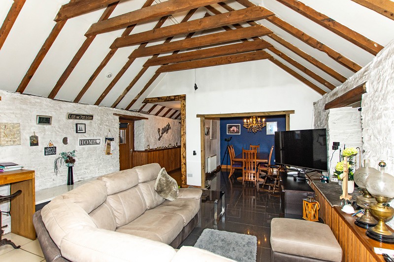 With 3.6 acres of land, this superb home has a rustic feel throughout and offers flexible and comfortable accommodation over two levels. There is a large open plan lounge/kitchen which has a vaulted ceiling and exposed beams with triple aspect windows to take in the rural views. The tastefully designed kitchen has an excellent range of grey base, full height and wall units with laminate worktops. A Rayburn with a wooden surround above creates a stunning focal point within this attractive room which also features exposed stone walls and tiled ceramic flooring. An opening off the lounge leads into the well-presented dining room which also has a drop-down chandelier light fitting. The inner hallway features exposed stone walls and windows with Caithness flagstone sills add character to this area of the home. There is a double downstairs bedroom which is ideally located near to the stylish family bathroom. This lovely room has a corner bath as well as a shower quadrant, W.C and pedestal basin. Throughout this home benefits from excellent storage with a large rear hall, utility as well as a beautifully presented master bedroom which also features exposed beams as well as an en suite with a superb Jacuzzi bath. Upstairs there is a superb family lounge which has exposed stone walls as well as another en suite bedroom.