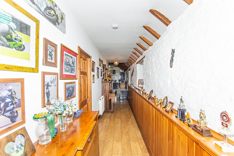 The inner hall is spacious with exposed stone walls and wooden wall panelling to half height. There are two central heating radiators, two pendant light fittings as well as exposed ceiling beams. Caithness flag adds character to this area of the home. There is laminate flooring and two windows face the rear elevation. There is a storage cupboard and doors lead to the bathroom and bedroom.