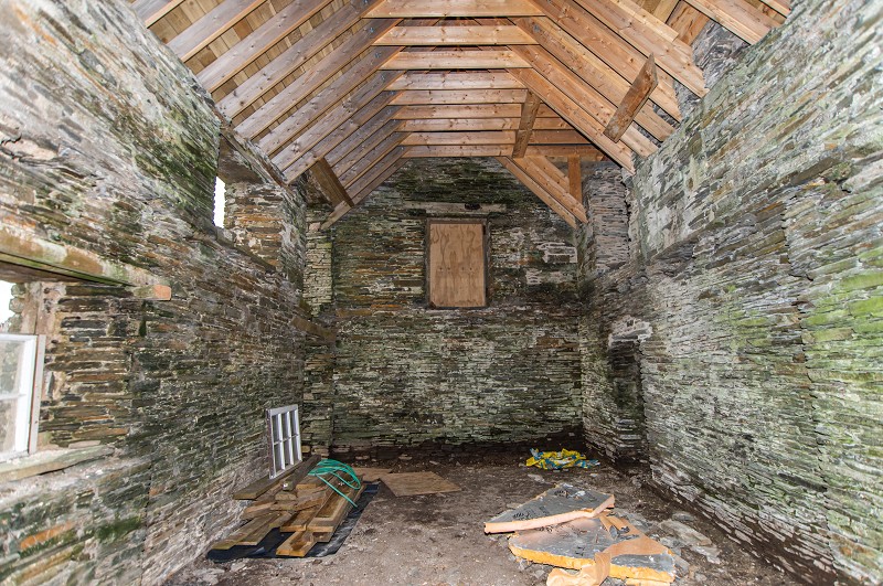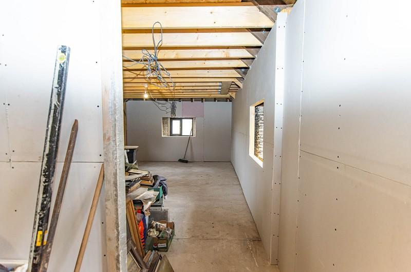 Accessed via a UPVC door with a glazed panel, the kitchen has been plumbed and has power connection. The walls have been plaster boarded and there is a velux window. Two windows face the front elevation. Steps give access to the lounge, with openings leading to the utility and bathroom.