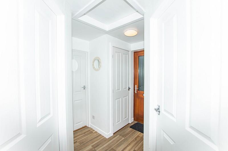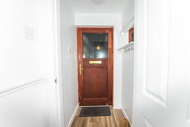 This area of the home has oak vinyl flooring and white painted walls. There is a storage cupboard, an access hatch to the loft void, a smoke alarm and flush light fitting. A partially glazed door leads outside. Further doors lead to the lounge, kitchen, bedroom and bathroom.