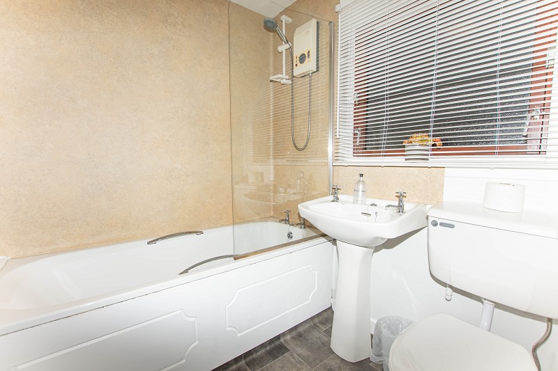 This bright room has a window with blinds to the rear elevation. There is a bath with shower above, a white WC, pedestal sink and a wall mounted mirror. Vinyl has been laid to the floor; there is a flush light fitting and white towel ladder radiator.