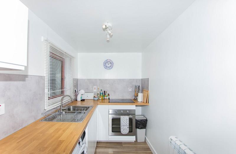 The gallery style kitchen is well equipped and benefits from white wall and base units with oak laminate worktops. There is a stainless-steel sink with drainer, a fridge-freezer and washing machine. This room benefits from an induction hob and single oven. Vinyl has been laid to the floor. Splash backs have been partially fitted to the walls. The kitchen benefits from an electric heater, a smoke alarm and triple light fitting. A window with blinds faces the rear elevation.