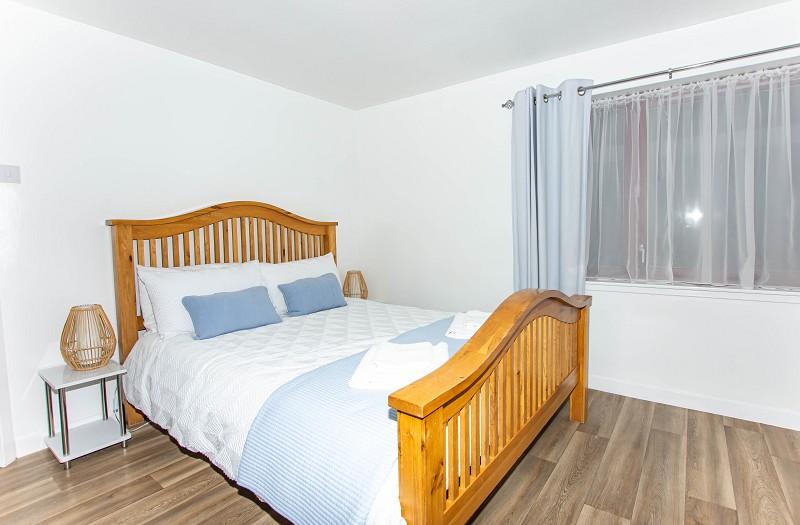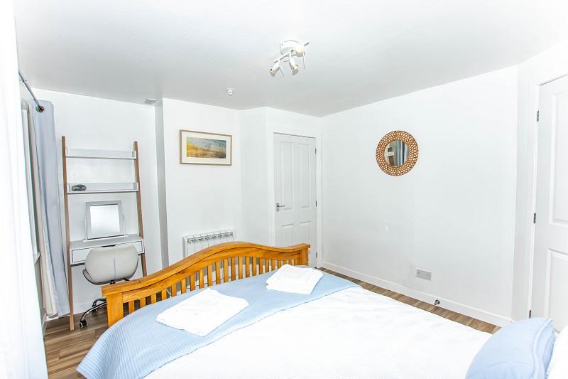 The stylish bedroom has a built-in wardrobe with both hanging and shelf space. The walls have been painted white and oak vinyl has been laid to the floor. There is a Kyros electric heater, double sockets and a triple light fitting. A window, dressed with curtains, faces the front elevation. There is also an ariel point.