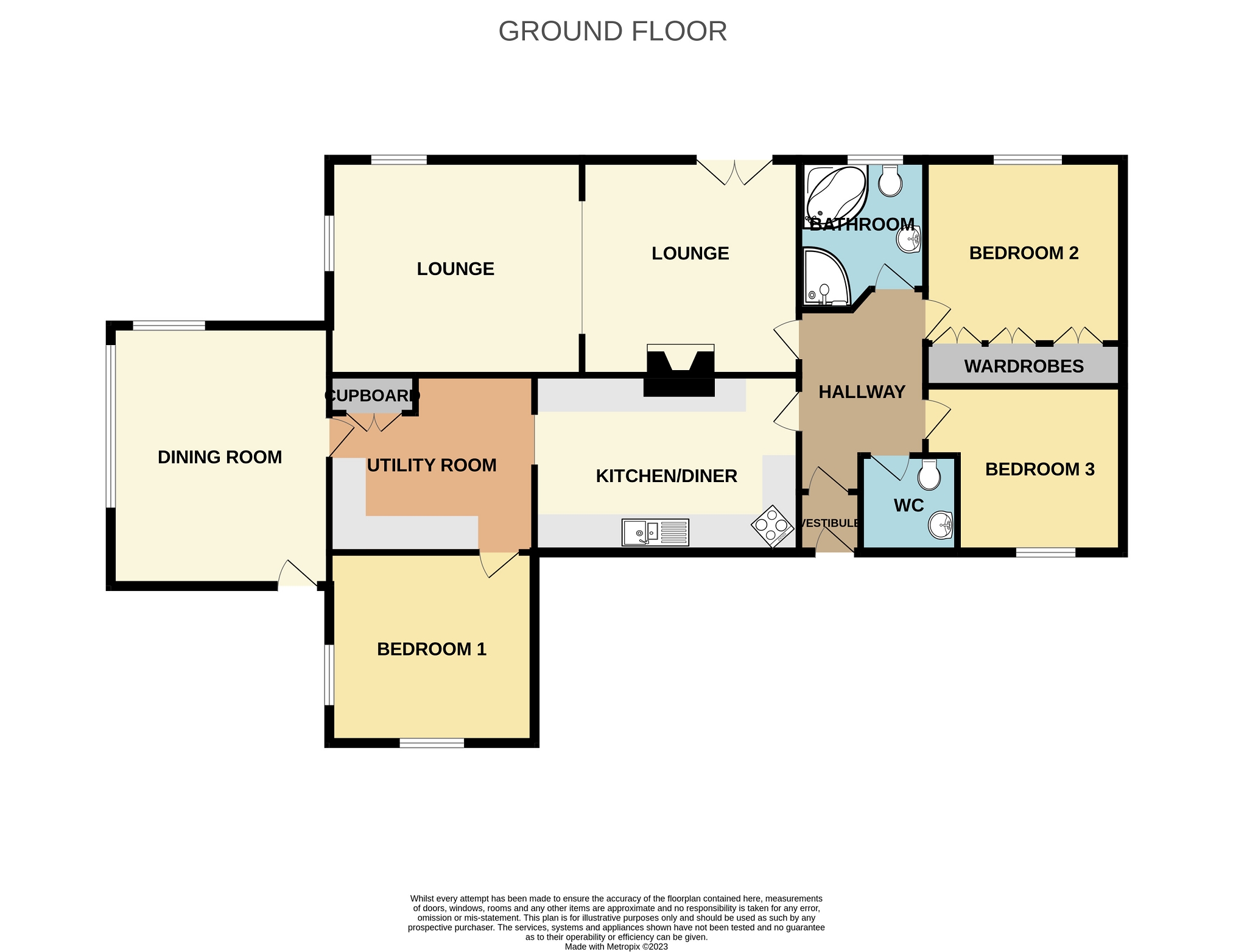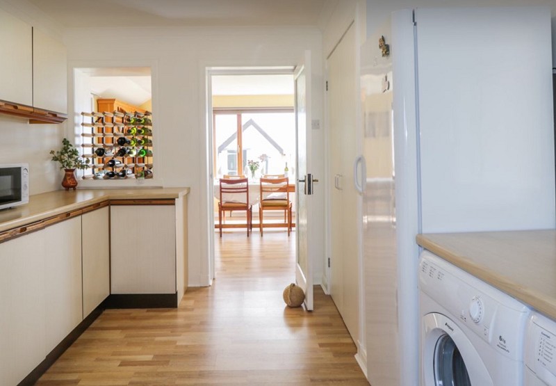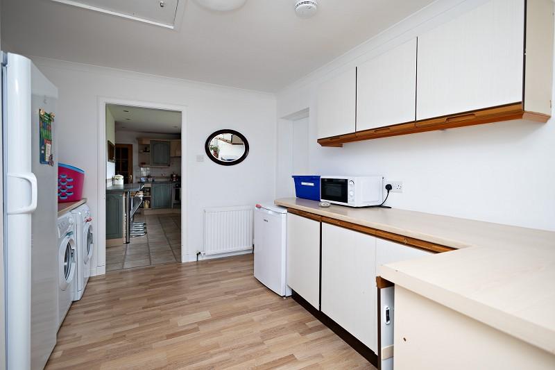 The kitchen benefits from a selection of base and wall units with green doors and wood effect trim with built-in spotlights to illuminate your working area and has matching worktops and decorative tiled splashbacks. The kitchen has been designed to make best use of the space and features an oven and hob set in to the corner with attractive cooker hood above and a one and a half bowl sink with drainer and mixer tap. A breakfast bar, which can accommodate up to 4 chairs, is along one wall. There is space for a dishwasher beside the sink and the oil central heating boiler is fitted under the worktops at one end. The large front facing window makes this a bright and airy room. There is a radiator and lighting is provided by gold trimmed spotlights complementing those in the kitchen units. A door leads from the kitchen to the utility room.