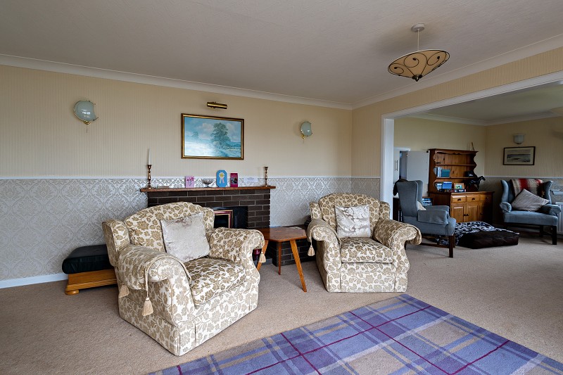 The bright generous lounge benefits not only from dual aspect windows but also large patio doors make the most of the spectacular country and sea views. This room features a large open arch which splits the room into two functional areas, to one side of the arch there are feature openings. One area benefits from a coal effect electric fire set in a stone hearth with brick surround and wooden mantle the generous patio doors lead out to the patio and garden beyond. The second area benefits from a serving hatch which opens into the utility room making this an ideal area for entertaining. This room is decorated in pleasing cream and gold tones with co-ordinating cream carpet. The room also benefits from three radiators, wall lights and two pendant light fittings.