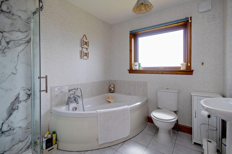 The bathroom is well equipped with a corner bath with mixer taps and shower head with a tiled splashback, a W.C., hand basin with tiled splashback and fitted mirror above, and a quadrant corner shower with wet wall benefitting from a mains shower unit. The floor is tiled and there is ladder towel radiator rail with fitted glass shelf above. An opaque window faces the rear of the home and there is a pendant light fitting and extractor fan.