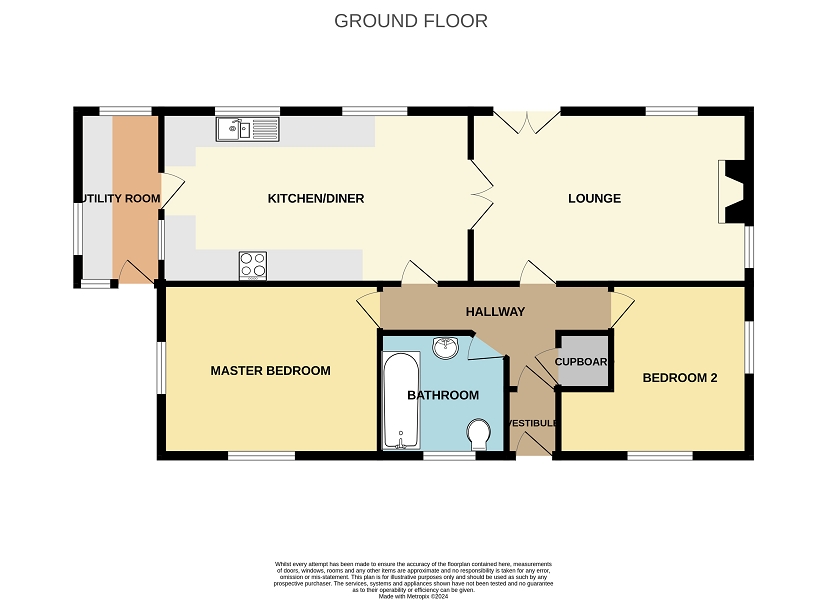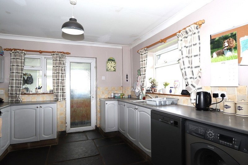 Accessed from a door in the hallway and also through french doors from the lounge. There are wall and base units with fitted worktops and tiled splashback. There is a stainless steel sink with drainer and mixer tap. There is services below the worktop for a washing machine and dishwasher. There is an opaque glazed door leading into the utility room and also a window facing into the utility room. There are two windows facing to the rear, a radiator to the wall and the flooring is laid to flagstones.