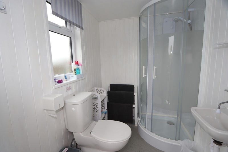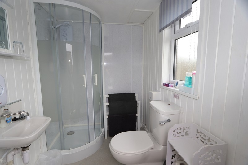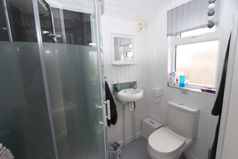 There is a shower fitted with shower boarding to the walls, W.C. and hand basin. The walls and ceiling are wood lined. An opaque window faces to the front.