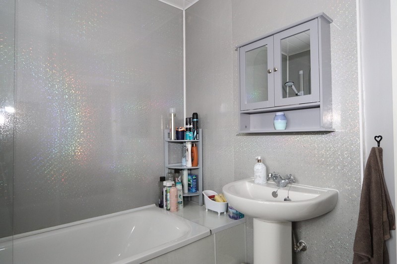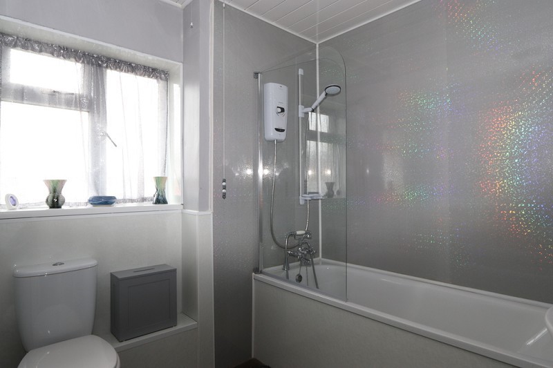 There is a bath with mixer tap and shower head, a Mira electric shower has been fitted above the bath and shower boarding has been fitted to the walls. There is a W.C. and a hand basin. Shower boarding has been fitted to the ceiling and also to most of the walls. An opaque window faces to the front. There is a heated towel rail and a mirrored cabinet is fitted to the wall. The flooring is laid to flagstones.