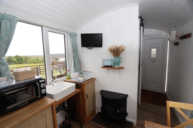 This is a self-contained camping pod made of timber construction with timber to the walls and ceiling. There is a UPVC entrance door and UPVC windows to both sides and rear. There is a small fitted kitchen area with bowl and mixer tap. There is a gas water heater. The flooring is laid to laminate and a door leads into the ensuite.