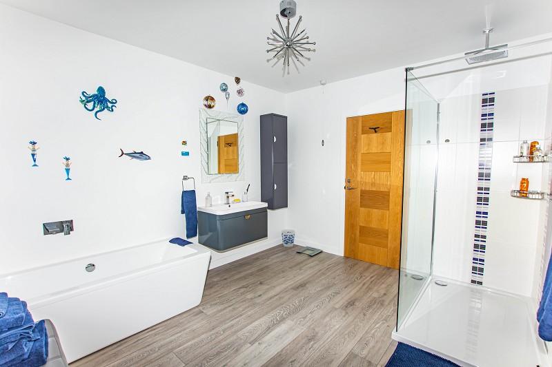 This stylish room benefits from a double shower and enclosure, a double ended bath, a WC and a basin which has been built into a grey vanity unit. There is also an extractor fan, a feature light fitting and an opaque window faces the rear elevation.