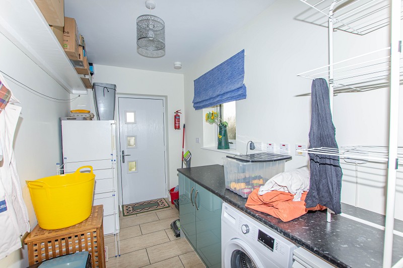 This bright room is spacious and has a window with a blind to the side elevation. Ceramic tiles have been laid to the floor. There is a wall mounted shelf, a laminate worktop and also double sockets throughout. A composite door gives access to the generous rear garden.