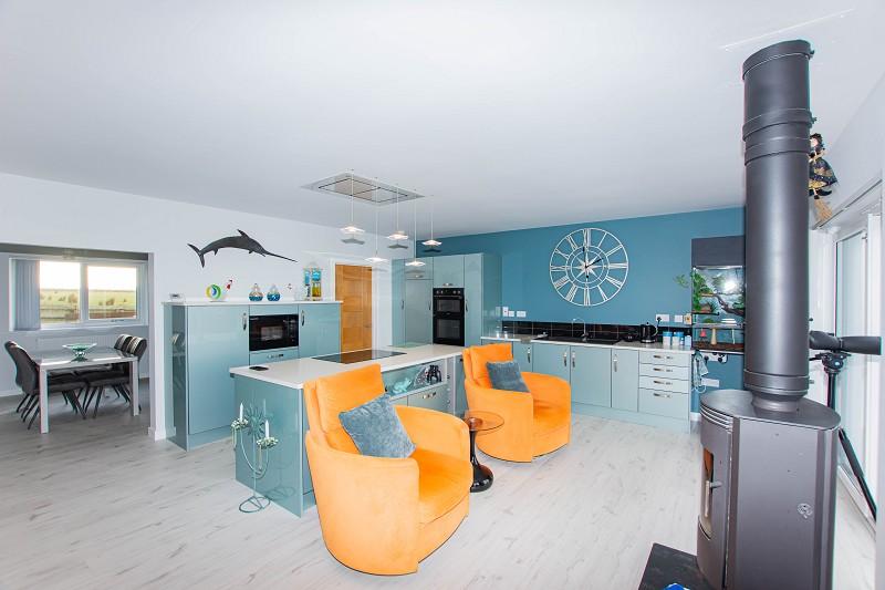 The stunning kitchen boasts two sets of sliding patio doors which give beautiful views over the countryside. There is a wood burning stove which sits on a Caithness Flagstone hearth as well as a central heating radiator. There are base and full height units with quartz worktops. Thoughtfully designed, the kitchen benefits from an integral induction hob with a glass extractor above, and integral microwave and a double oven. There is a black sink with drainer, feature drop-down light fitting and laminate has been laid to the floor. An opening leads to the dining room and a door gives access to the utility room.