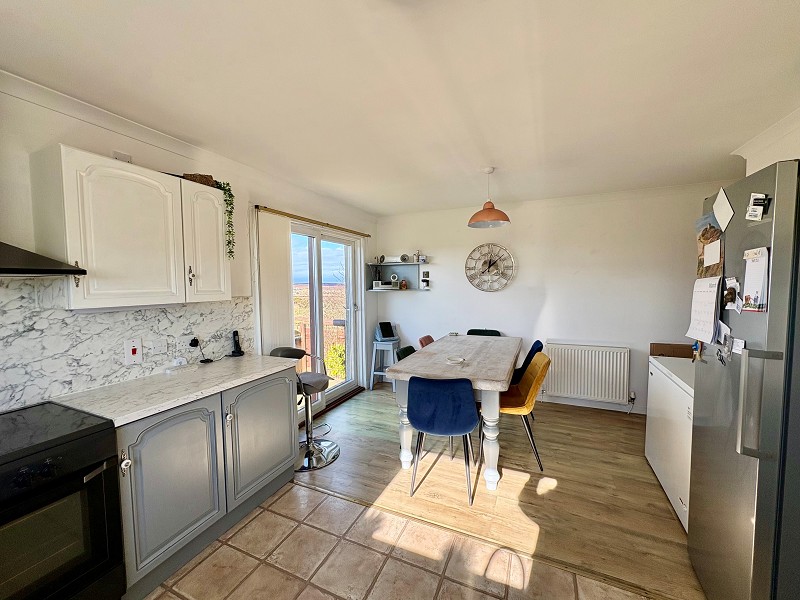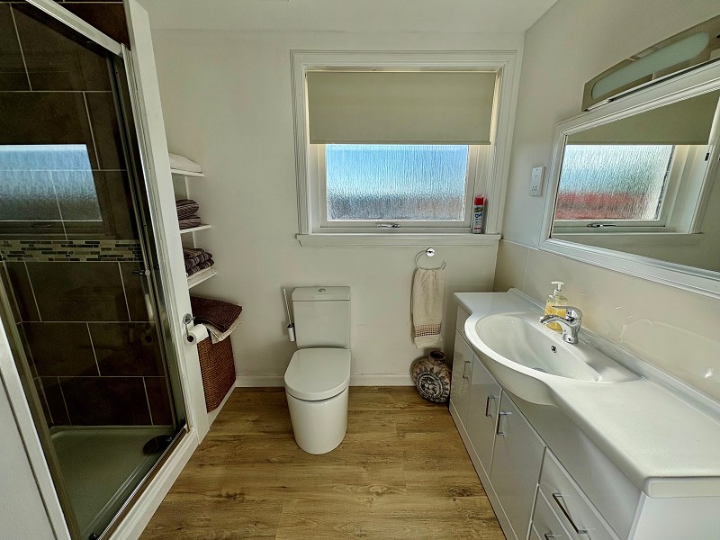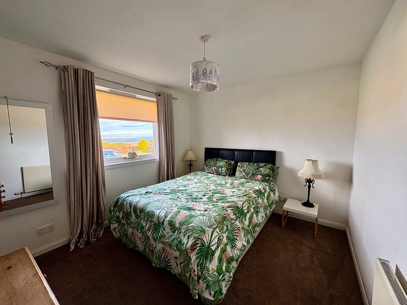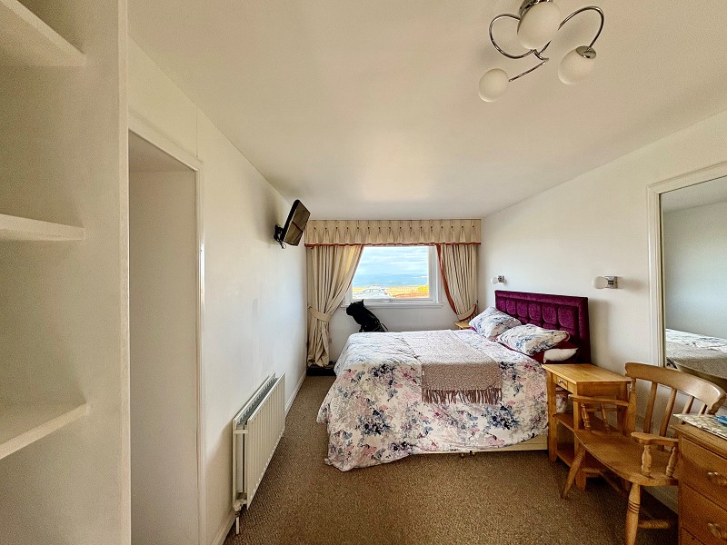 This beautiful room has dual aspect windows, fitted with blinds, which enjoy an outlook towards Stroma and the Orkney Islands. A focal point within the room is the multi-fuel stove which sits on a Caithness flag hearth. There are two central heating radiators, wall lights as well as smoke alarms. A carpet has been laid to the floor and coving has been fitted to the ceiling. There are ample double sockets and also a phone point.
