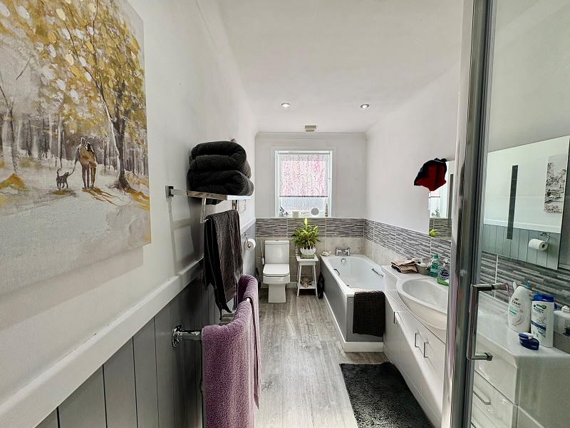 The beautiful bathroom benefits from wooden panelling as well as tiling and vinyl flooring. There is a white WC, a bath and generous shower enclosure. The basin has been built into a white vanity unit and the room also benefits from coving, ceiling down lighters and an extractor fan. There is also a wall mounted mirror and shaving point as well as a towel ladder radiator.