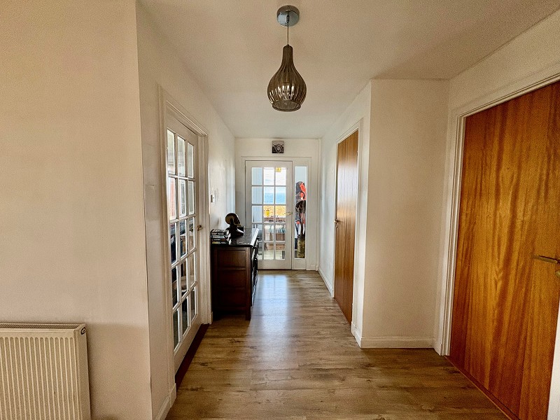 The hallway is spacious with white painted walls and oak laminate flooring. A cupboard provides storage, there is a smoke alarm and two pendant light fittings. A hatch gives access to the loft void and doors lead to the lounge, kitchen, three bedrooms and the bathroom.