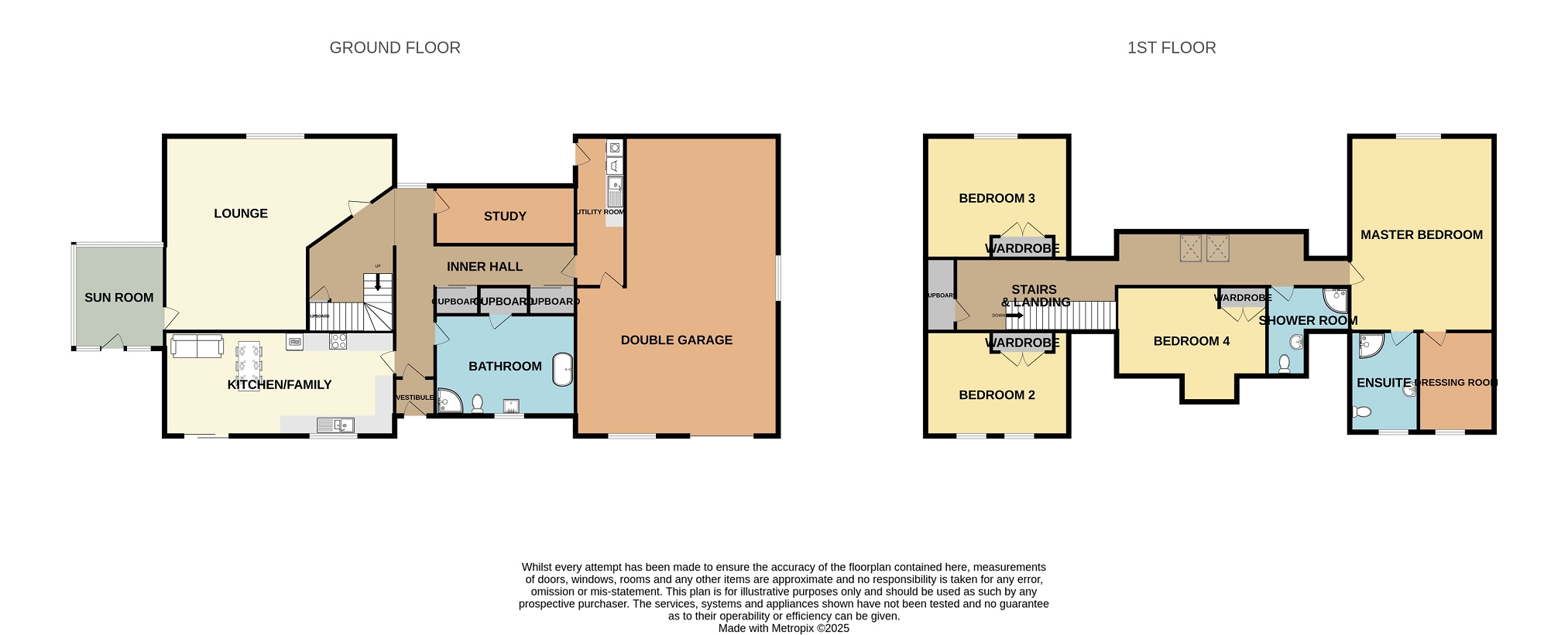 The ground floor further benefits from a spacious family bathroom with freestanding bath and separate shower cubicle, a well-equipped utility room with access to the substantial integral garage complete with workshop area and a well-proportioned study which could alternatively be utilised as a fifth bedroom.