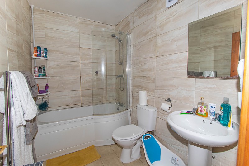 The beautiful bathroom is neutral in décor. There is tiling from floor to ceiling, a chrome towel radiator as well as a bath with a shower above. This room benefits from a wall mounted mirror, a triple pendant light fitting, an extractor fan as well as vinyl flooring.