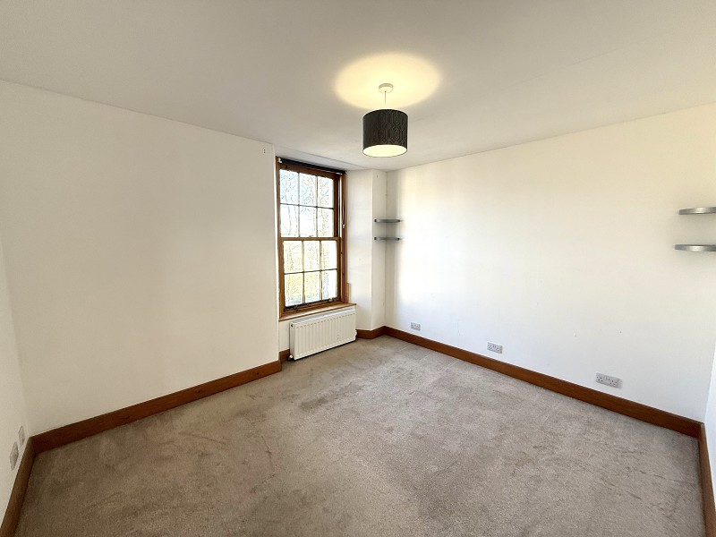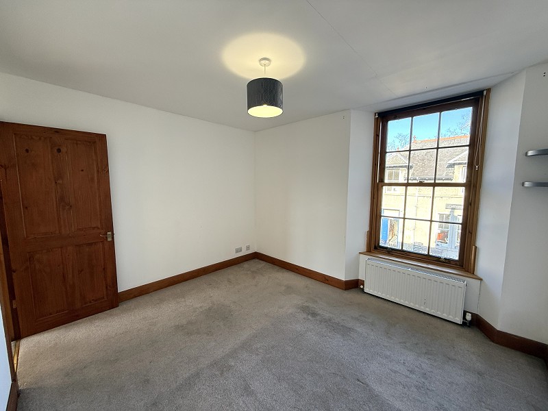 Neutral in décor with white painted walls, this spacious room also benefits from a beige fitted carpet. A window with a roller blind faces the front elevation. There are double sockets as well as a pendant light fitting.