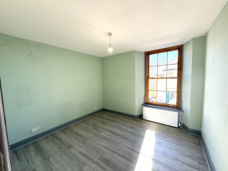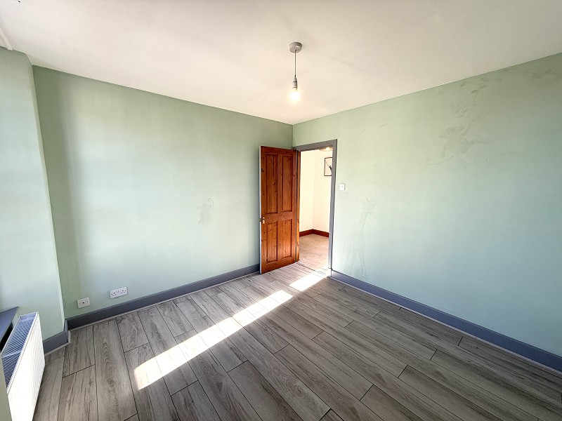 This lovely room has a feature mural wall and grey laminate flooring. A sash and case window faces the front elevation; there is a central heating radiator as well as a pendant light fitting and double sockets.