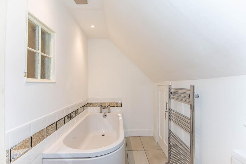 This spacious room is partially coombed. There are white painted walls, a central heating radiator, an arial point and double sockets. A hatch gives access to the loft void and there are ceiling downlighters. A sash and case window faces the rear elevation and enjoys an outlook over the large rear garden. This beautiful room also benefits from a beige carpet and an original fireplace with a stunning cast iron surround.