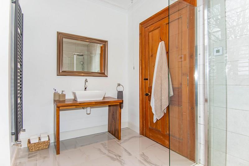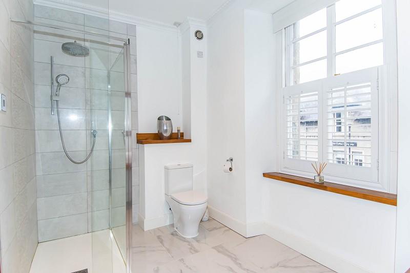 This stylish room has marble floor tiles, a W.C and a basin which is built into a wooden vanity unit. There is a grey towel ladder radiator, coving an extractor fan and ceiling downlighters. A window with wooden blinds faces the front elevation and there is a generous double shower enclosure with a wireless Mira control.
