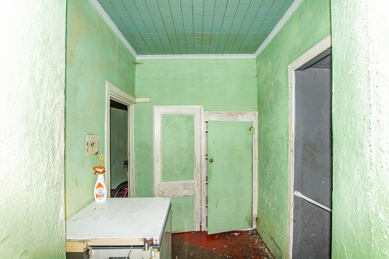 This room has exposed floor boards and partially papered walls. There is a feature window to the side elevation and a stainless-steel sink with drainer. There are ample power points and space can be found for a washing machine. The utility room benefits from two shelved storage cupboards and fluorescent lighting.