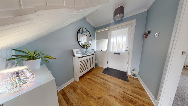 This bright and welcoming hallway is accessed via a half-glazed timber door with a half-glazed panel to the side. The flooring has been laid to wood-effect vinyl, and the walls have been painted a light blue. Above a pendant light fitting, smoke detector and coving can be found. There is also a useful understairs storage cupboard. This room also benefits from a central heating radiator on the wall, covered by a modern radiator cover. Doors lead to the lounge and kitchen. A carpeted staircase leads to the first-floor landing.
