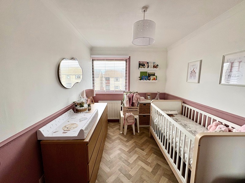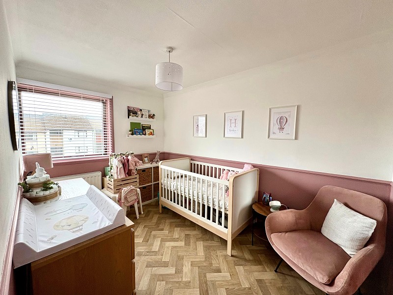 This bright L-shaped bedroom benefits from a window that faces the front elevation, with a central heating radiator below. The walls have been painted pink to half height, and the remainder has been painted neutral. The flooring has been laid with modern wood-effect herringbone vinyl. This room also benefits from a built-in storage cupboard with hanging and shelf space. Above, a pendant light fitting can be found.