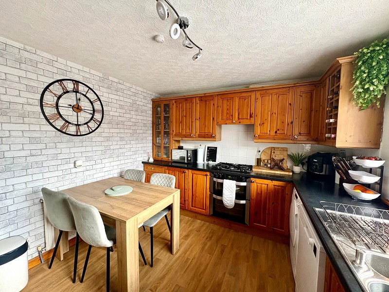 The kitchen has wooden wall and base units with complementary laminate worktops and a white tile splashback. There is a feature papered wall, and the flooring has been laid to wood-effect vinyl. The kitchen benefits from a stainless-steel sink with a drainer and mixer tap, and below there is space for a washing machine, tumble dryer and dishwasher. There is a four-ring gas hob with an integral oven and integrated cooker hood above, as well as space for a standing fridge/freezer. Above there is a four-piece light fitting and smoke detector, and a large window faces the rear elevation.