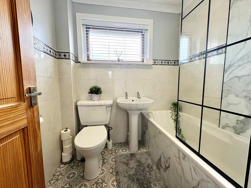 This stunning bathroom benefits from a w.c. and standalone pedestal sink. There is a newly installed shower over bath with a wet wall and modern glass screen. The flooring has been laid with mosaic vinyl, and the walls have been tiled to ¾ height, and the remainder has been painted. There is an opaque window that faces the rear elevation. Above a light fitting and coving can be found.