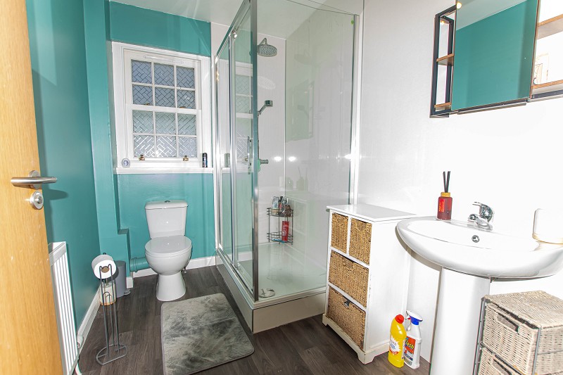The shower room is spacious and benefits from a generous shower enclosure with chrome shower attachments. The walls have been partially fitted with wet-wall and grey vinyl has been laid to the floor. There is a central heating radiator, a WC and pedestal basin. This room benefits from an extractor fan, chrome light fitting and also a wall mounted mirror with built in shelving. A window faces the rear elevation.